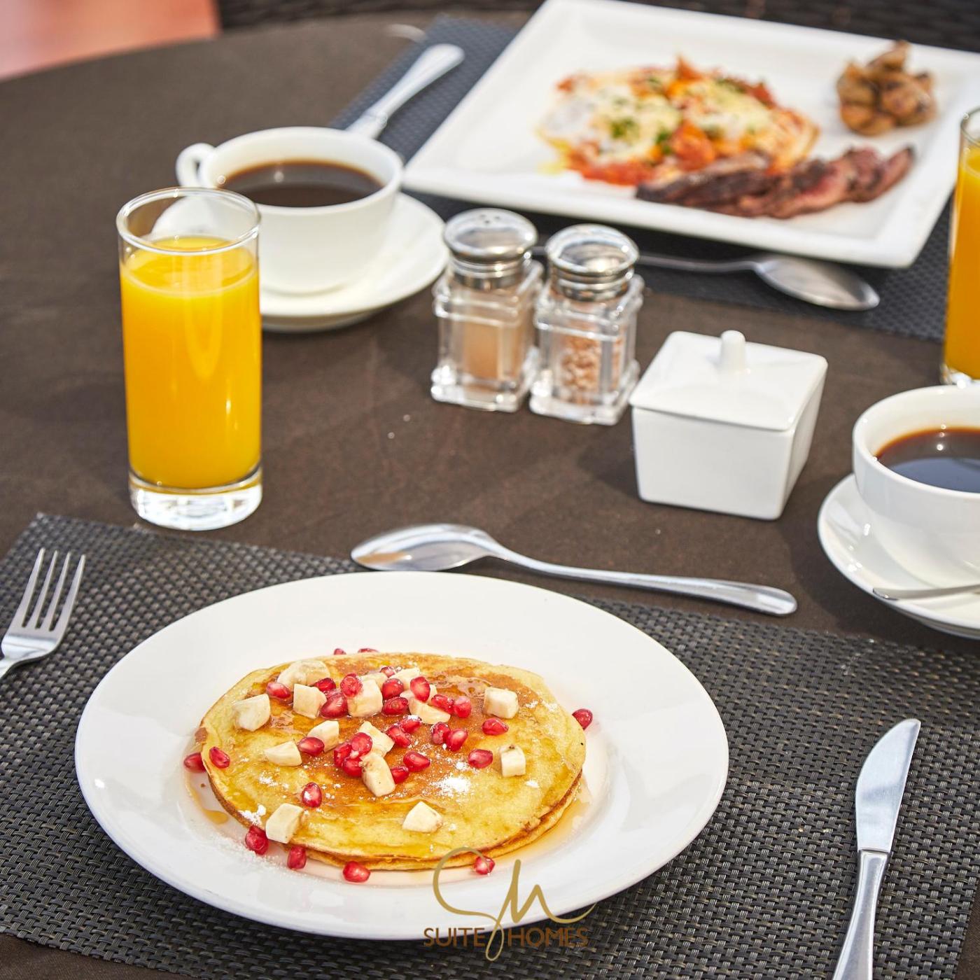 A selection of options including pancakes, fruits and juice is available for the continental breakfast.